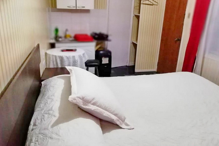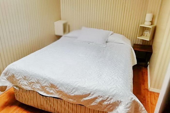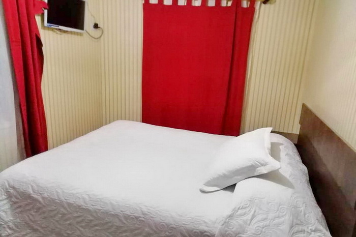 Habitación matrimonial, con una cama de dos plazas. baño privado y una pequeña cocina